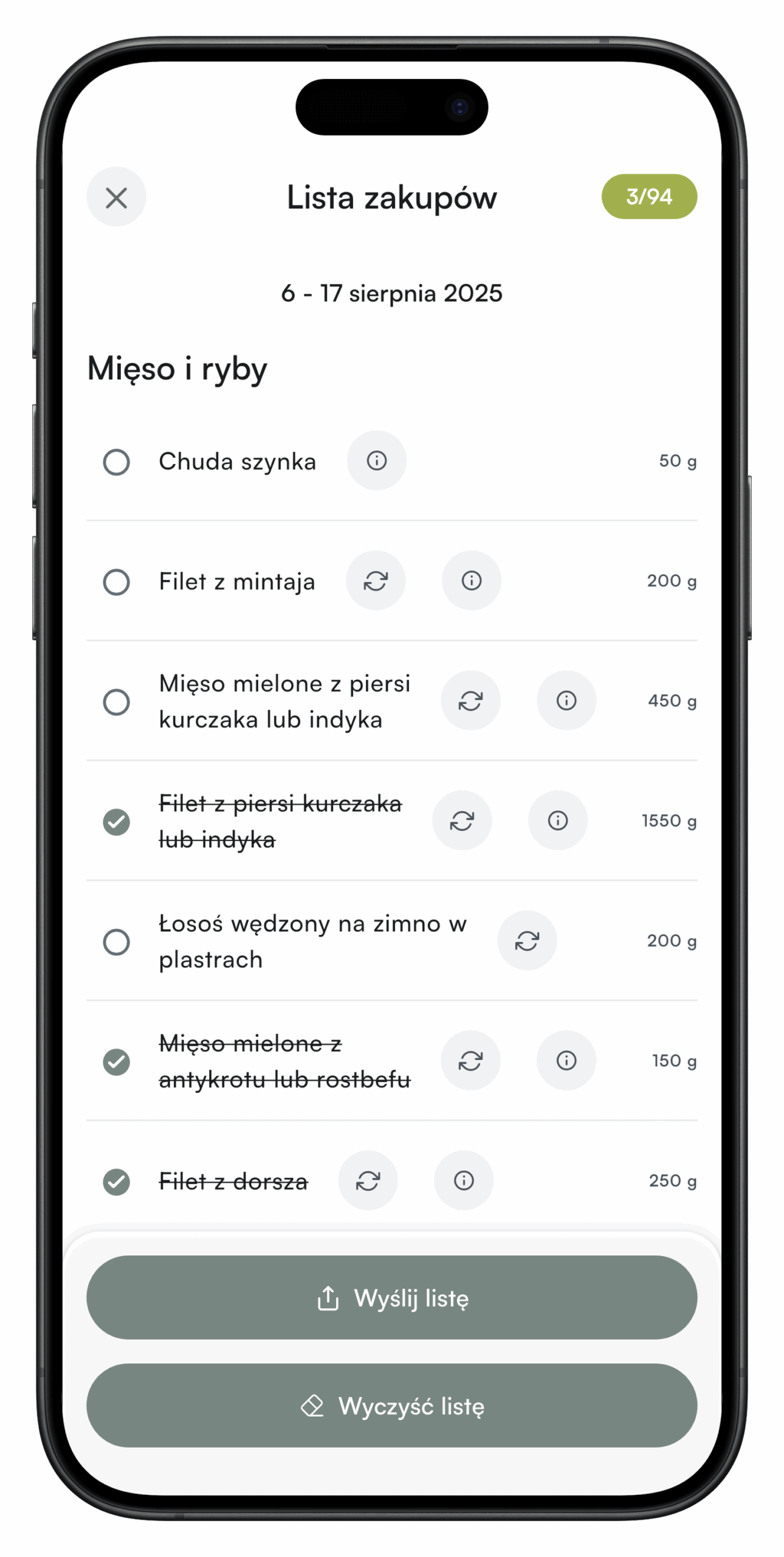 Generuje się automatycznie z Twojego planu i kalendarza posiłków. Jest przejrzysta, intuicyjna i podzielona na alejki sklepowe - dzięki niej oszczędzasz czas i robisz zakupy bez pomyłek.